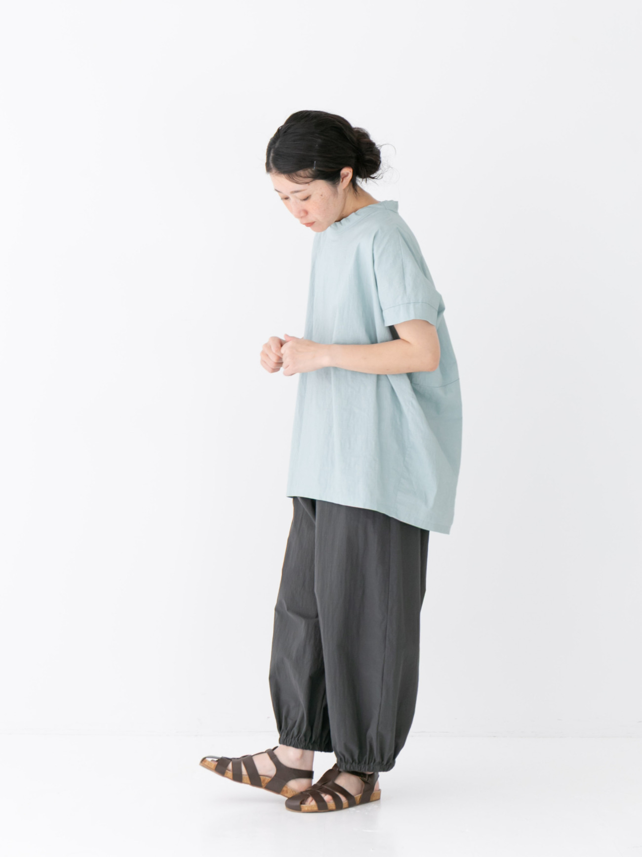 コットンナイロン交織平織ワッシャー裾ゴムバルーンパンツ